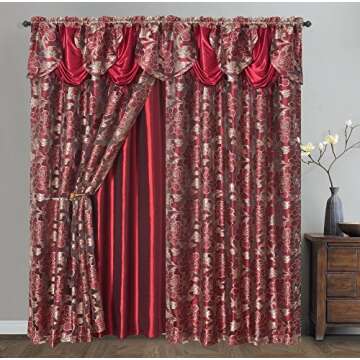 GOHD - Royal ROSARIUM. Clipped Voile. Farmhouse Jacquard Window Curtain with Attached Fancy Valance and Taffeta Backing. 2pcs Set.Each pc 58 inch Wide x 84 inch Drop + 18 inch Valance. (Wine)
