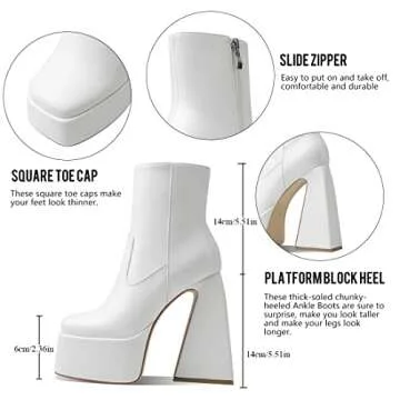 Goiphrri Womens Chunky Heel Ankle Boots Platform Block High Square Toe Zipper Punk Combat Motorcycle Mid Calf Boots For Women White Boots