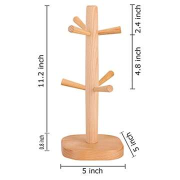 GOJAKO 12" Wooden Mug Holder Tree with 6 Hooks Wood Cup Rack Tea Coffee Bar Organizer Accessories Mug Hanger Stands for Kitchen Counter and Display Dinnerware Storage and Dry (Square Bottom)