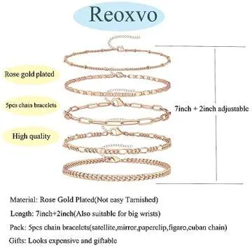 Show moreIntroducing the Gokeey Dainty Gold Chain Bracelet Set, a truly exquisite collection of bracelets that effortlessly combines style with comfort. Crafted with 14k real gold plating, these bracelets are designed with care to ensure they remain tarnish-free even after repeated wear. Each bracelet in this 5-style layered collection showcases a unique design concept, making them versatile enough for any occasion. From the delicate satellite chain to the chic figaro chain, these bracelets provide an endless array of styling options, allowing you to layer them or wear them individually as your mood dictates.
