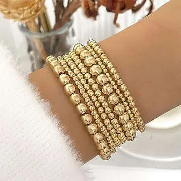 Gold Beaded Bracelets for Women 14K Gold Plated Bracelets Jewelry Trendy Stretch Gold Beaded Bracelet Stack Dainty Stackable Beaded Bracelets Boho Bead Ball Bracelets Set Trendy Gifts Christmas Stocking Stuffers