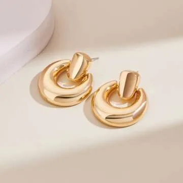 Show moreElevate your style and make a statement with our exquisite Gold Dangle Earrings for Women. These chunky gold drop earrings feature a stunning door knock design that effortlessly complements any outfit, perfect for transitioning from a busy day at work to a glamorous night out. Crafted with premium, environmental-friendly materials, these earrings are not only visually appealing but also designed for comfort, allowing you to wear them all day without discomfort. With a length of 1.14 inches and a width of 1 inch, these lightweight accessories (weighing only 8.5 grams) are a delightful addition to your jewelry collection.