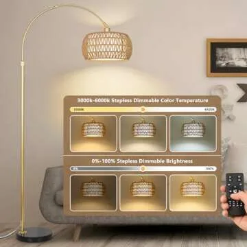 Show more Welcome to the world of modern illumination with the Eyassi Arc Floor Lamp! This exceptional piece harmoniously combines functionality and style, making it a perfect addition to any living space. With its multiple control options, including remote, foot switch, and app functionality, you can effortlessly enhance your environment—from dimming the light for cozy evenings to brightening up your reading nook. The lamp's innovative features empower you to adjust brightness and color temperature easily, creating the ideal ambiance for every occasion.