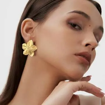 Show more Introducing our stunning Gold Flower Studs Earrings, an exquisite blend of personality and elegance designed specifically for modern women. Crafted with a focus on quality and comfort, these earrings are made of superior materials, featuring a luxurious 14K gold plating that ensures durability while adding a beautiful sheen. Each stud earring is meticulously designed as a big floral statement piece, making it a captivating accessory that can elevate any outfit effortlessly. Not only do these earrings stand out for their stunning appearance, but they also offer a lightweight wear, allowing you to enjoy them from morning till night without any discomfort.