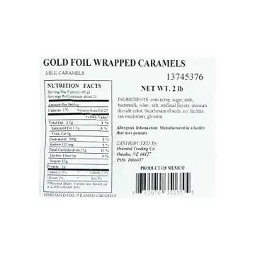 Show moreIndulge in a premium sweet treat that adds a touch of elegance to any event with our Gold Foil Wrapped Caramels. Perfectly crafted, these delicious caramels offer a buttery, smooth texture that melts in your mouth, making them the ideal addition to your candy buffet. With an impressive bulk size of 2 pounds, you receive approximately 189 individually wrapped pieces, each adorned in shiny gold foil that beckons attention and enhances any decor. Whether you are planning a wedding, a birthday party, or a festive celebration, these caramels are sure to impress your guests.