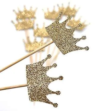Show moreTransform your celebration into a royal event with our Gold Glitter Crown Cupcake Toppers. Perfectly designed for first birthdays, baby showers, and weddings, these stunning cupcake decorations combine vibrant aesthetics with functionality. Each topper is made from high-quality paper with natural bamboo toothpicks, ensuring durability without compromising safety. They boast a sparkling gold glitter finish that enhances any dessert table, giving your sweets an extra touch of elegance without the worry of glitter shedding. Besides being visually appealing, our cupcake toppers are designed to add charm and joy to your special moments.