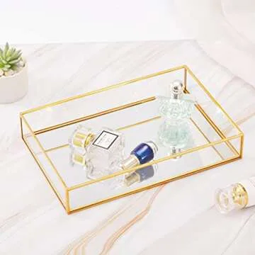 Show moreIntroducing the Gold Mirror Decorative Tray, your perfect companion for organization and style! Crafted from durable materials, this eye-catching tray measures 11.8" x 7.9" x 2" and weighs just 30oz, making it both lightweight and versatile. The clear glass tray showcases a stunning mirrored bottom that captures light beautifully, while the elegant gold finish frame adds a touch of sophistication to any setting. It's designed without a lid, allowing for easy access to your essentials and making storage a breeze.