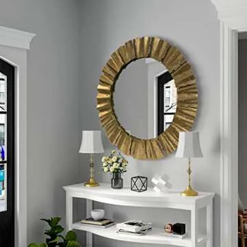 Show moreElevate your home decor with our exquisite handcrafted Gold Mirror, a stunning piece that merges artistry and functionality. This gorgeous round wall mirror features a hand-forged and hand-hammered metal frame that reflects exceptional craftsmanship, accentuated with a luxurious antiqued gold leaf finish. It is not just a mirror but a statement piece that can transform any space, infusing it with a touch of glamour. Measuring 32 inches, this large decorative mirror is perfect for your living room, entryway, bathroom, or bedroom, creating a captivating focal point wherever it’s placed.