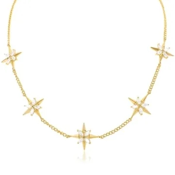 Show more Introducing the exquisite Gold North Star Choker, a stunning addition to any jewelry collection that combines elegance with a touch of celestial charm. Crafted with a premium 14K gold-plated brass cable chain, this gorgeous choker features five dazzling zirconia north star charms, each meticulously cut to radiate captivating brilliance. Designed to fit snugly around the neck, it accentuates your neckline and adds an air of sophistication to any outfit—perfect for both casual outings and formal occasions. The gold north star choker is not only an accessory but a statement piece that showcases your unique style while offering a glimpse of the night sky's beauty.