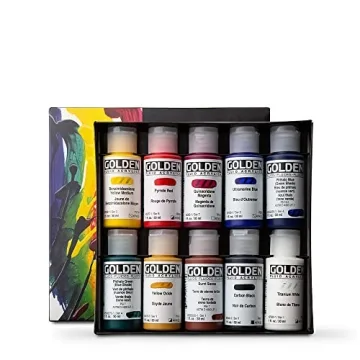 Show moreUnleash your creativity with the GOLDEN Fluid Acrylics, Principal Professional Fluid Set, an extraordinary selection that caters to both amateur and professional artists alike. This meticulously curated set includes ten 1 fl. oz. / 30 ml bottles of vibrant colors such as Benzimidazolone Yellow Medium, Pyrrole Red, Quinacridone Red, Ultramarine Blue, and more, allowing you to explore an extensive palette without boundaries. The fluid consistency ensures an even and smooth application, promoting an effortless blending process while retaining the vibrant intensity of each color.