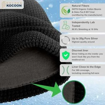 Show moreIntroducing the Golden Kocoon® E-M-F Organic Cotton Beanie, the perfect blend of style, comfort, and protection. Designed for adults, this chic black cap is not just a fashion accessory; it’s a shield against electromagnetic frequencies (EMF) and Wi-Fi signals. Made from premium organic cotton and featuring a unique EcoShield™ Tech bamboo Lyocell faraday fabric with a silver lining, it offers incredible EMF shielding while ensuring breathability and all-day comfort. With careful attention to crafting, this beanie reflects the commitment of Golden Kocoon, a small family-owned business led by EMF experts.