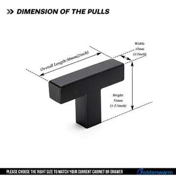 Show moreIntroducing the goldenwarm 10 Pack Black Cabinet Knobs—the perfect blend of aesthetics and functionality for any modern home. Crafted with care, these matte square dresser knobs elevate not only the style of your cabinets but also ensure durability and ease of use. Made from high-quality stainless steel, these knobs boast a matte black finish that adds a touch of elegance to your décor. Whether it’s your kitchen, bathroom, or dresser drawers, these knobs are designed to harmoniously fit various styles of wooden furniture, making them a versatile choice for any room.