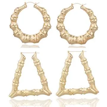 Goldtone 3.25 Inch Bamboo Style Hoop Earrings and a Triangle Bamboo 3.5 Inch Hoop (E-788 + E-799)