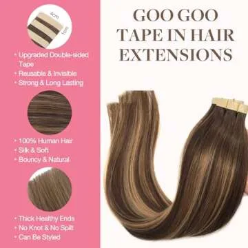 GOO GOO Tape in Hair Extensions Human Hair, 4/27/4 Balayage Chocolate Brown to Caramel Blonde, 16inch 50g 20pcs, Thick Ends Straight Seamless Tape in, Invisible Tape in Hair Extensions Human Hair
