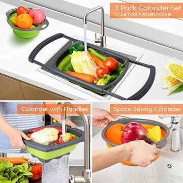 Goodking 3 Pack Collapsible Colander Set, Over the Sink Food Colanders Strainers with Extendable Handles, 6-Quart& 4-Quart& 2-Quart, Space-Saving Kitchen Foldable Strainer for Draining Vegetable Fruit