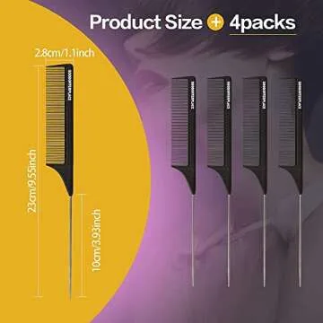 Show more Discover the ultimate hair styling tool with our premium set of rat tail combs, designed to bring your hairstyling dreams to life. Crafted from durable plastic and featuring a heat resistance of up to 248°F (120°C), these combs are perfect for both professional stylists and at-home users alike. The unique design combines a parting comb's versatility with the precision of a teasing comb, allowing you to effortlessly create intricate braids and stylish sections. Each comb in this 4-piece set measures 9.55 x 1.1 inches, making them the ideal size for handling every hair type and length.