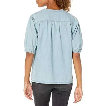 Goodthreads Women's Denim Puff Sleeve V-Neck Shirt, Light Wash, Medium