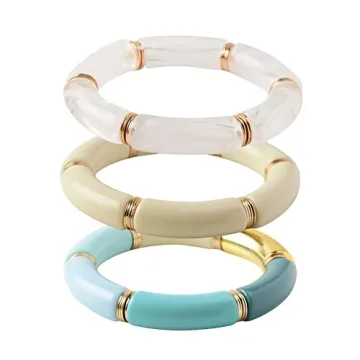 GOOJIDS Bamboo Tube Bangles Bracelet Chunky Curved Stacking Clear Acrylic Colorful Beads Stretchable Friendship Gold Bracelets Gift For Women (Q-Blue 3pcs set)