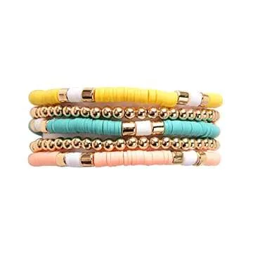 GOOJIDS Surfer Heishi Clay Bead Bracelets for Women Bohemian Stackable Gold Beaded Stretch Bracelets Elastic Layering Friendship Bracelets Set Boho Jewelry