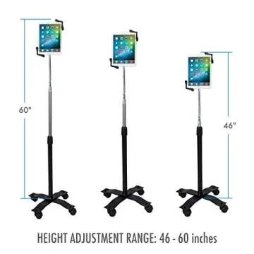 The innovative design ensures that every angle is covered with its jointed tablet holder that tilts side to side and rotates a full 360 degrees. Switch between landscape and portrait easily, accommodating any requirement at a moment's notice. Plus, with the height-adjustable telescoping pole, you can customize the height to fit your setup perfectly, needing only between 8.625 to 15.5 inches of space.