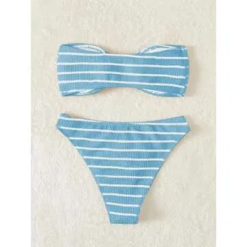GORGLITTER Women's 2 Piece Strapless Swimsuit Striped Bandeau High Waisted Thong Bikini Set Bathing Suit Light Blue