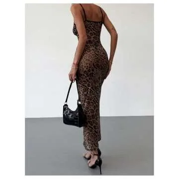 GORGLITTER Women's Cheetah Leopard Y2k Mesh Bodycon Dress Lace Trim Sleeveless Maxi Cami Dresses Brown Medium