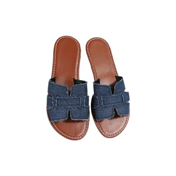 GORGLITTER Women's Denim Sandals H Band Flat Slide Sandals Slip On Open Toe Blue EUR39