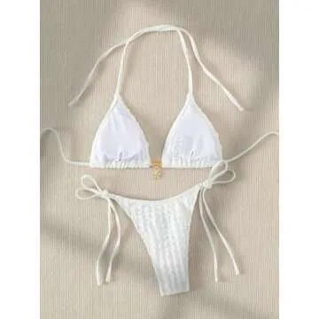 GORGLITTER Women's High Cut Textured Halter Triangle Tie Side Swimsuit Bathing Suit White Small