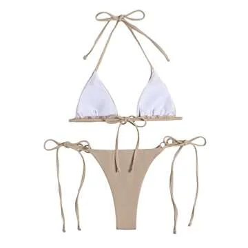 Show more Introducing our stunning bikini set, designed to create a confident and flattering silhouette for every woman. This excellent bikini incorporates micro triangle tops, which are both stylish and comfortable, featuring a secure tie at the neck and back. The sleeveless, wire-free design enhances comfort, while the removable padded cups ensure strong support, allowing you to customize your fit according to your preferences.