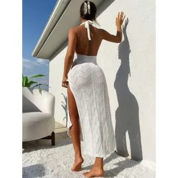 Show more Introducing the GORGLITTER Women's Split Tie Back Crochet Cover Up Dress, the ultimate beachside companion that embodies both style and comfort. Crafted from premium knit material, this stunning cover-up is designed to enhance your beachwear collection with its modern and sexy aesthetics. The dress features a breathtaking hollow-out back that adds a touch of allure while ensuring you stay cool during sun-soaked adventures. Its sleeveless design, tie-back functionality, and chic halter neck structure create a flattering silhouette, accentuating your natural curves. The elegant side split allows for ease of movement, making it the perfect choice for both lounging by the pool and striding along the sandy shores.