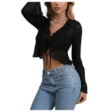 Sheer mesh crop top, v neck, long sleeve, flounce sleeve, tie front, ruffle trim, sexy see through blouse
