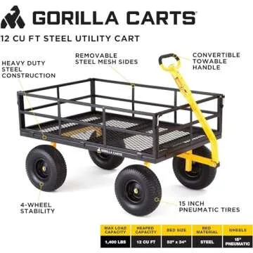 Show moreIntroducing the Gorilla Carts GOR1400-COM Steel Utility Cart, the ultimate solution for all your hauling needs. Renowned for its impressive 1400-pound capacity and robust steel mesh construction, this heavy-duty cart is designed to make light work of transporting heavy loads, making it an essential tool for gardeners, landscapers, and anyone in need of reliable transportation for bulky items. Its patented 2-in-1 convertible handle allows for both hand-pulling and easy towing behind ATVs or lawn tractors, providing unparalleled versatility. With a spacious 52" x 34" bed and the ability to easily convert to a flatbed, this cart is not just a simple wagon; it’s an investment in quality and efficiency.