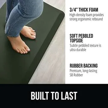 Show more Introducing the Gorilla Grip Cushioned Anti Fatigue Mat – your ultimate solution for comfort and support in any room. Measuring 48 inches by 20 inches, this mat is designed with a generous 3/4 inch thick high-quality foam that combines luxurious cushioning with a strong rebound effect. Perfect for those long hours in the kitchen, at standing desks, or even in laundry rooms, this mat ensures your feet and ankles receive the necessary support they deserve. Experience the plush softness while enjoying the benefits of an ergonomic design that helps relieve pressure and fatigue throughout the day.