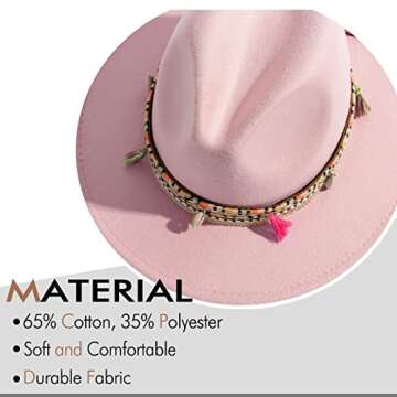 Gossifan Women's Felt Fedora Hat Wide Brim Panama Hats with Tassel-Pink