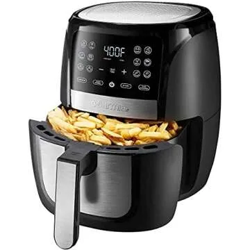 Show more Introducing the Gourmia 6-Quart Digital Air Fryer, a must-have kitchen appliance designed to transform the way you cook. This innovative air fryer allows you to enjoy healthier meals with significantly less oil, thanks to its advanced Fry Force 360° Technology. Whether you're craving crispy French fries or perfectly baked pastries, this versatile device does it all! With 12 one-touch preset modes, you can conveniently air fry, bake, dehydrate, and more at just a tap of a button.
