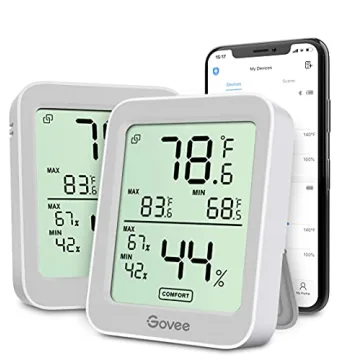 Introducing the Govee Indoor Hygrometer Thermometer 2-Pack, a cutting-edge solution for all your temperature and humidity monitoring needs! Designed for precision and user-friendliness, this device boasts a remarkable Bluetooth range of 196ft/60m, enabling seamless connectivity to your smartphone through the Govee Home app. With a Swiss-made sensor that ensures temperature accuracy of ±0.54°F and humidity accuracy of ±3%RH, you can be confident that you are receiving the most precise information...