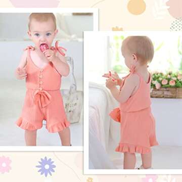 Show moreIntroducing the GOYONYING Newborn Infant Baby Girl Clothes Ruffle Romper, a delightful ensemble designed for your precious little one. Crafted from high-quality cotton, this romper features a ribbed texture that ensures a soft and skin-friendly experience for your baby girl. The outfit is not only cozy and comfortable but also designed with adorability in mind, making it an ideal choice for daily wear or special occasions. With a charming sling design and button closures at the chest, putting on and taking off this outfit is effortless, allowing parents to manage dressing with ease. Whether your baby is at home, attending a family gathering, or enjoying a sunny day out, this romper is set to become a favorite in her wardrobe.