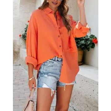 Gozoloma Women's Casual Blouse Long Sleeve Shirt Cotton Linen Button Up Loose Top (0029-Orange-L)