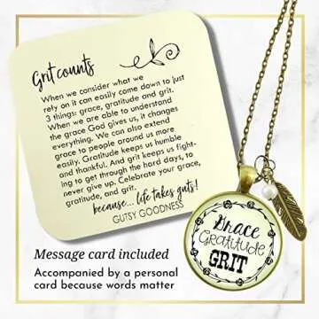 Grace Gratitude Grit Necklace Southern Country Inspired Fashion Jewelry For Women 36" Chain - Handmade Bronze Western Chic Quote Pendant, Bohemian Feather Charm, Gift Package Theme Message Card & Box