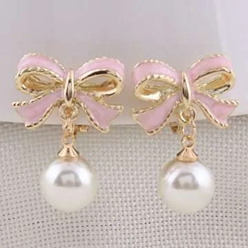 GRACE JUN Pink Bowknot Shape Clip on Earrings Without Piercing for Women Pearl Drop Earrings(Pink Bowknot Clip-ons)