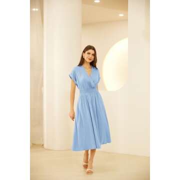 GRACE KARIN Blue Dress for Women High Waist Self V Neck Pleated Flowy A Line Midi Dress XL