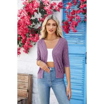 Show more Introducing the GRACE KARIN Light Weight Cardigan, the ultimate fashion staple for every woman's wardrobe! This exquisitely crafted women’s 3/4 sleeve cropped bolero shrug is designed to keep you stylish and comfortable during the warmer months. Made from a lightweight and breathable material, this cardigan offers just the right amount of stretch for ease of movement. Its chic V-neck design and button-down placket give it an elegant flair, while the hollowed-out texture adds a touch of sophistication. Perfect for layering over dresses or pairing with casual outfits, this cardigan is bound to become a favorite in your spring and summer collections.