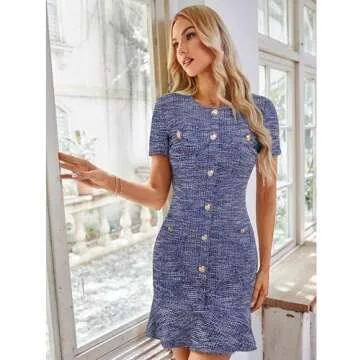 GRACE KARIN Mini Dresses for Women Fashion Bodycon Short Sleeve Tweed Dress Business Work Fall Clothes 2024 with Pockets Navy Blue 10