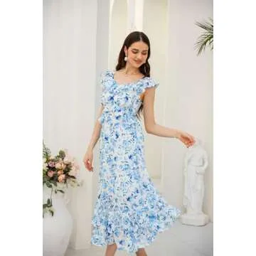 GRACE KARIN Women's 2024 Spring Sleeveless Boho Wedding Guest Ruffle V Neck A-Line Flowy Maxi Dresses Floral Blue L