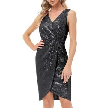 Show moreStep into the spotlight with the GRACE KARIN Women's Sexy Sequin Sparkly Glitter Party Dress, a breathtaking piece designed to make you the center of attention at any event. With its mesmerizing sequins and flattering silhouette, this sleeveless party dress combines style and comfort seamlessly. The surplice V-neck enhances your neckline, while the ruched front and irregular wrap hem create an elegant flow that hits just above the knee. Tailored to hug your body in all the right places, this midi dress wonderfully showcases your figure, making it perfect for parties, nights out, and special occasions.