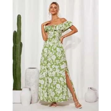 Show more Introducing the **GRACE KARIN Women's Summer Dresses Ruffle Off Shoulder Sundress**, your go-to elegant attire for embracing the sun in style! This stunning long maxi dress features a vibrant floral design perfect for summer events. Crafted with versatility in mind, it presents a unique ruffle elastic neckline that allows you to wear it in two fabulous ways: as an alluring off-the-shoulder dress or as a chic scoop neck. Designed to flatter various body shapes, this dress boasts a smocked back and a high split, accentuating your curves and providing comfort as you move. Experience the perfect blend of elegance and ease this season!
