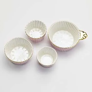 Show moreTransform your cooking and baking experience with the Gracie China by Coastline Imports Gold Trim Pink Porcelain Fluted 4-Piece Measuring Cup Set. This exquisite set marries functionality with a touch of elegance and charm. Made of high-quality ceramic, each measuring cup features a delicate fluted design that not only serves its purpose beautifully but also adds a stylish flair to your kitchenware. The soft pink hue, accented by luxurious gold trim, makes these measuring cups a perfect blend of aesthetics and utility. Designed to make daily culinary tasks a delightful experience, this set includes 1 cup, 1/2 cup, 1/3 cup, and 1/4 cup measurements, ensuring you have the right tool for every recipe. While they are dishwasher safe, please remember to avoid the microwave due to the gold trim.