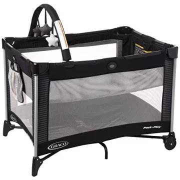 The Graco Pack 'n Play is ingeniously designed with folding feet and wheels that provide a 20% more compact fold compared to traditional playards. This means you spend less time struggling with setup and more time enjoying precious moments with your little one. The full-size infant bassinet adds convenience by offering an elevated sleeping area that is easy to reach, ensuring you can attend to your baby with minimal fuss. To keep your child entertained, the integrated toy bar features soft toys that dangle and amuse, enhancing playtime as well as sleep time.