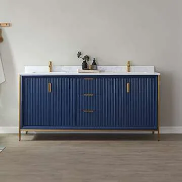 Show moreIntroducing the Granada 72" Vanity in Royal Blue with White Composite Grain Stone Countertop – a perfect blend of elegance and functionality for your bathroom space. This vanity features a rugged stainless-steel frame, ensuring long-lasting durability and a sophisticated aesthetic with its striking royal blue finish. Crafted with eco-friendly technology, the moisture-proof board construction offers exceptional sturdiness, making it an excellent choice for humid environments.