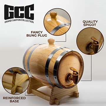 Show morePresenting the GRAND CANYON COLLECTION Whiskey Barrel Dispenser, your new centerpiece for sophisticated gatherings and stylish home décor! Constructed from premium quality pine, this stunning wooden barrel enhances your home with its charming, rustic appeal while effortlessly storing and dispensing your favorite spirits, beers, or liquors. Perfectly sized at 5 liters, it combines functionality with aesthetic excellence—offering a beautiful, leak-proof design that features a convenient spigot and a classy wooden stand. Whether you're enjoying a quiet night in or hosting an elegant soirée, this decorative barrel is here to elevate your drinking experience, making every sip a moment to savor.